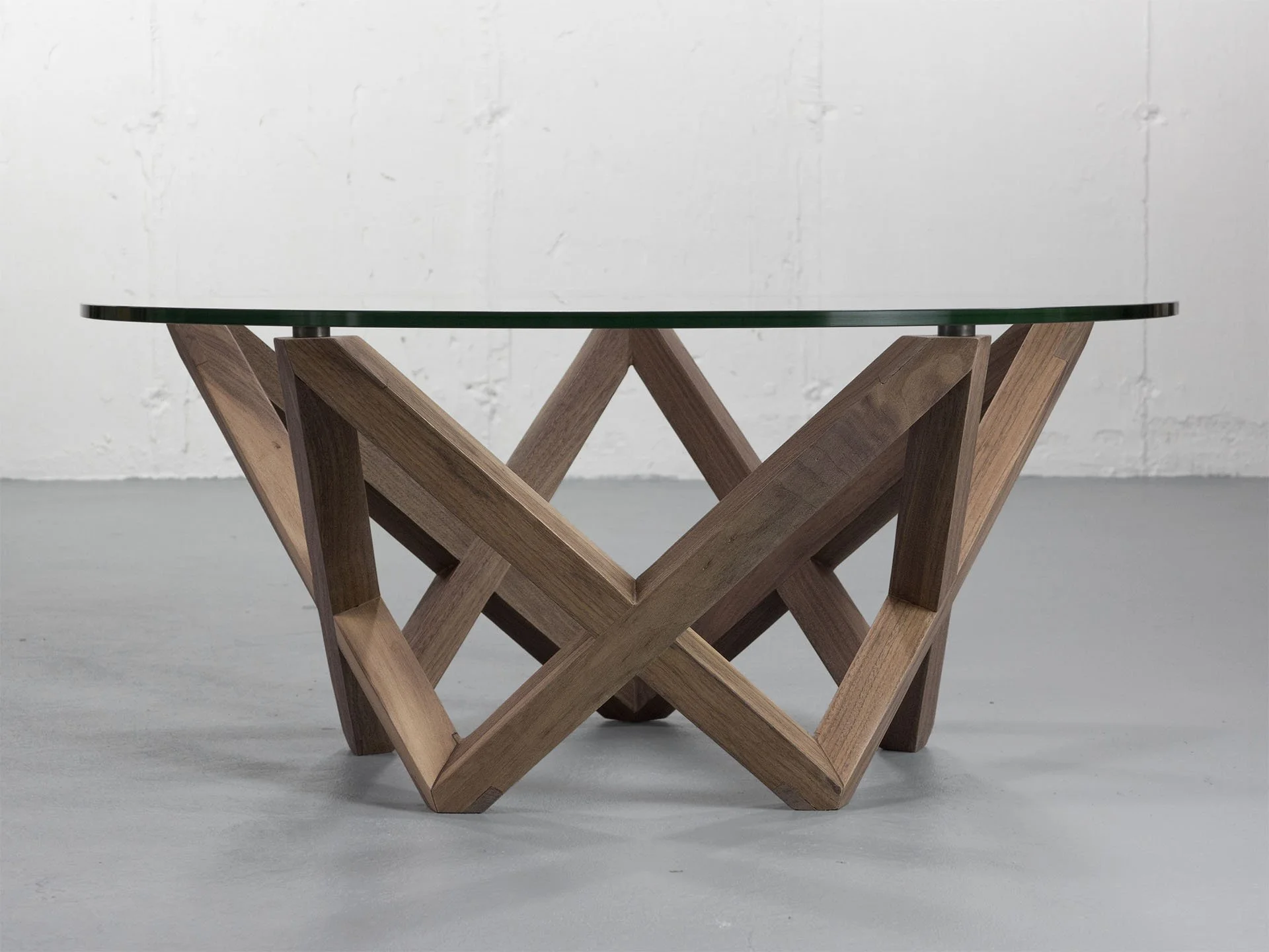 The Star Coffee Table is made of black walnut and glass with brass attachments. The glass is suspended by a five-point star that comprises the legs. Each leg flows seamlessly around the table perimeter.